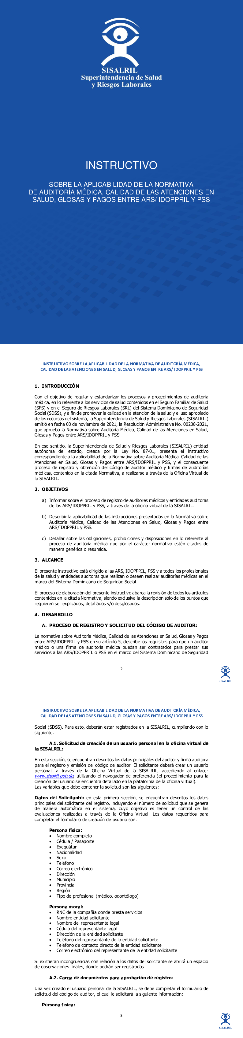 Instructivo sobre la Aplicabilidad de la Normativa de Auditoria Medica, Calidad de las Atenciones en Salud, Glosas y Pagos entre ARS - IDOPPRIL y PSS | 830.10 KB | DescargarPrevisualizar |