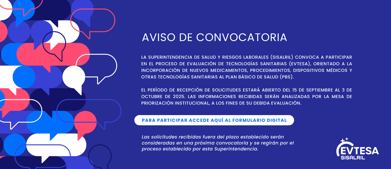 Para cualquier información sobre el proceso de Evaluación de Tecnologías Sanitarias (EVTESA), ponemos a su disposición los siguientes canales de comunicación para consultas, sugerencias o inquietudes: