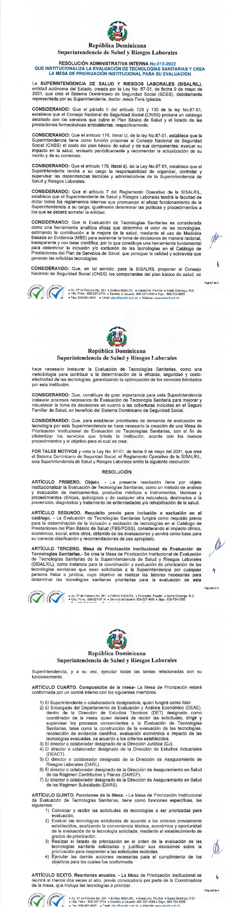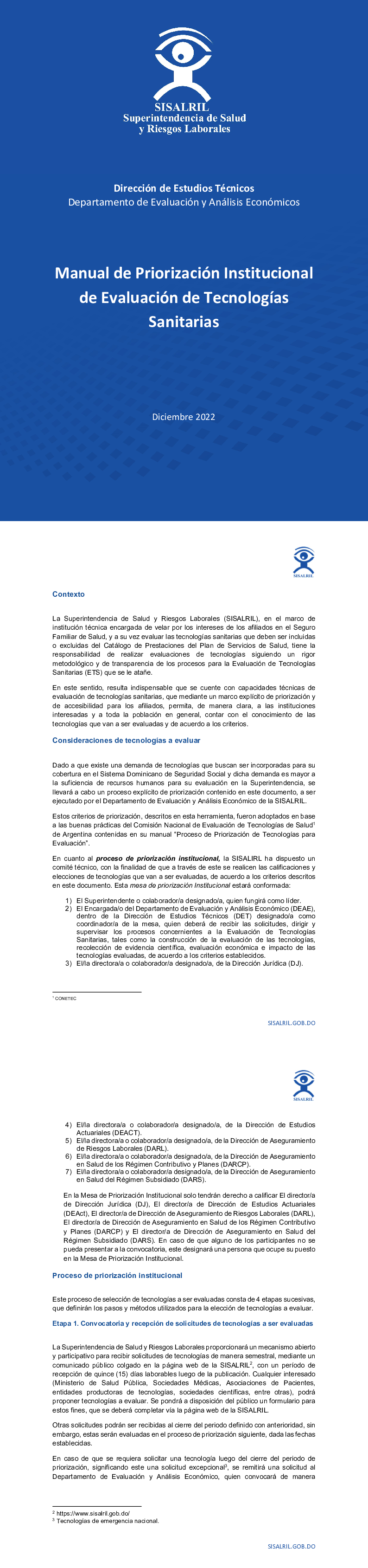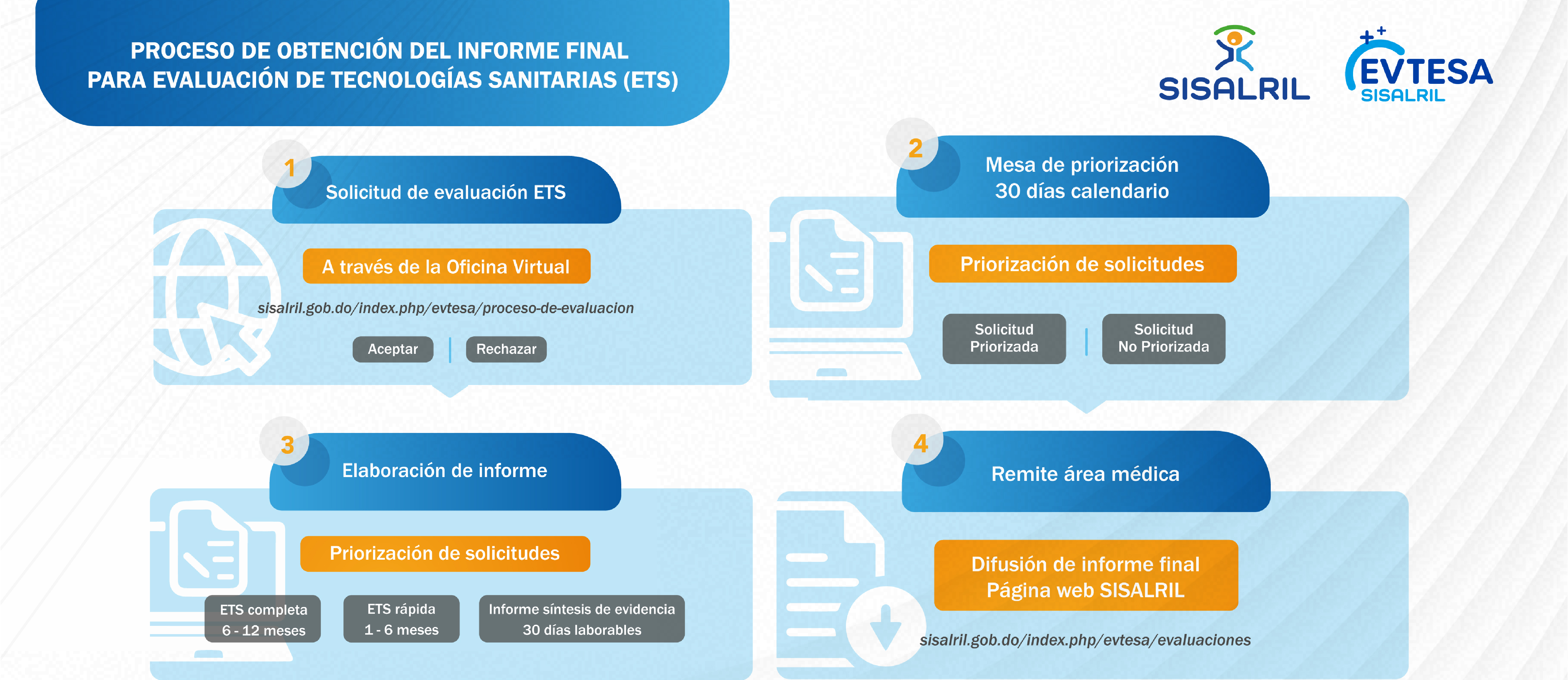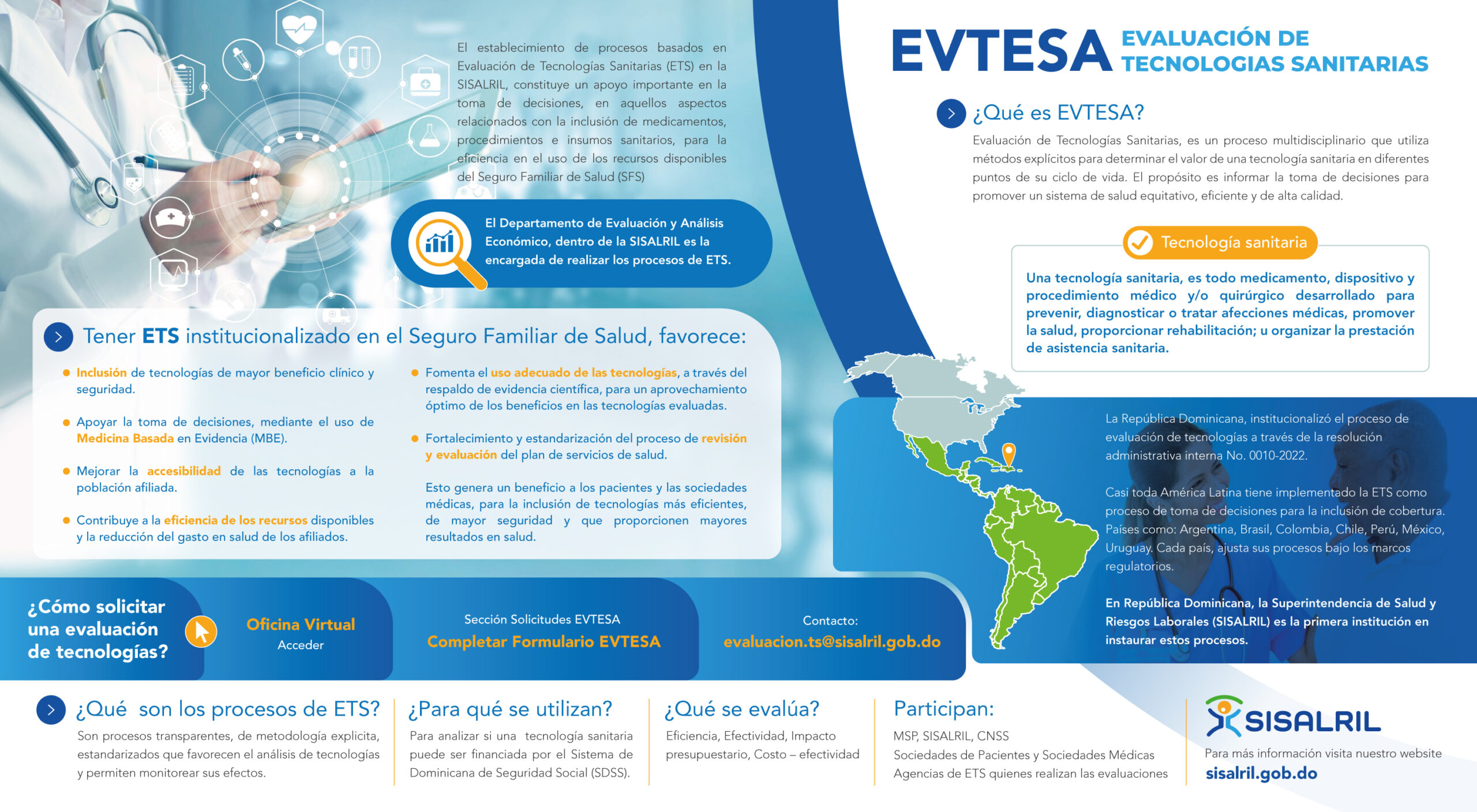 El establecimiento de procesos basados en Evaluación de Tecnologías Sanitarias (EVTESA) en la SISALRIL, constituye un apoyo importante en la toma de decisiones, en aquellos aspectos relacionados con la inclusión de medicamentos, procedimientos e insumos sanitarios, para la eficiencia en el uso de los recursos disponibles del Seguro Familiar de Salud (SFS), en lo concerniente al rol de la Superintendencia, como institución técnica de apoyo en las decisiones de Seguridad Social, para asegurar las coberturas, mejoras del plan de servicios de salud y su financiamiento.