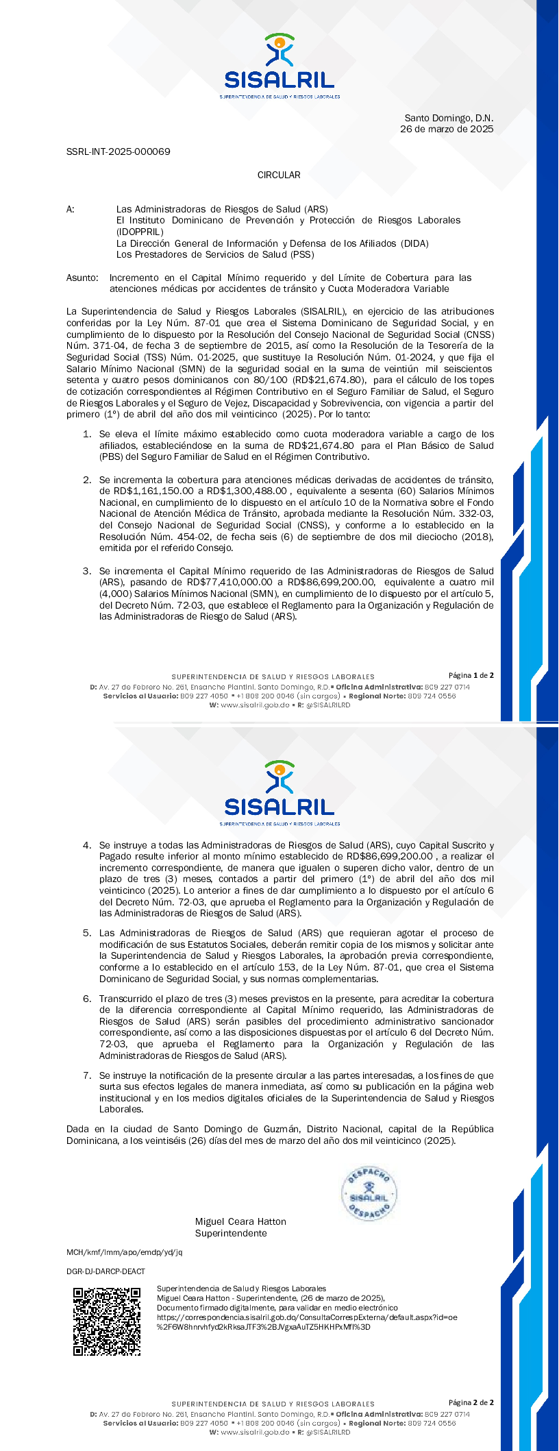 Circular Núm. SSRL-INT-2025-000069: Incremento en el Capital Mínimo requerido y del Límite de Cobertura para las atenciones médicas por accidentes de tránsito y Cuota Moderadora Variable. de Capital Minimo Requerido y del Limite de Cobertura