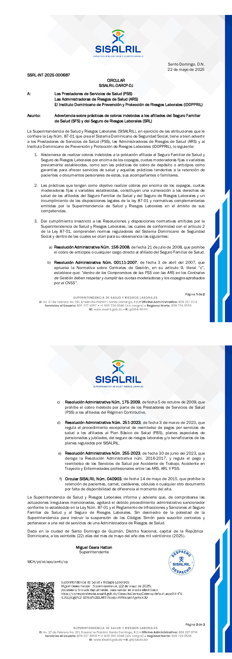 Circular Núm. SSRL-INT-2025-000687 Advertencia sobre prácticas de cobros indebidos a los afiliados del Seguro Familiar de Salud (SFS) y del Seguro de Riesgos Laborales (SRL).