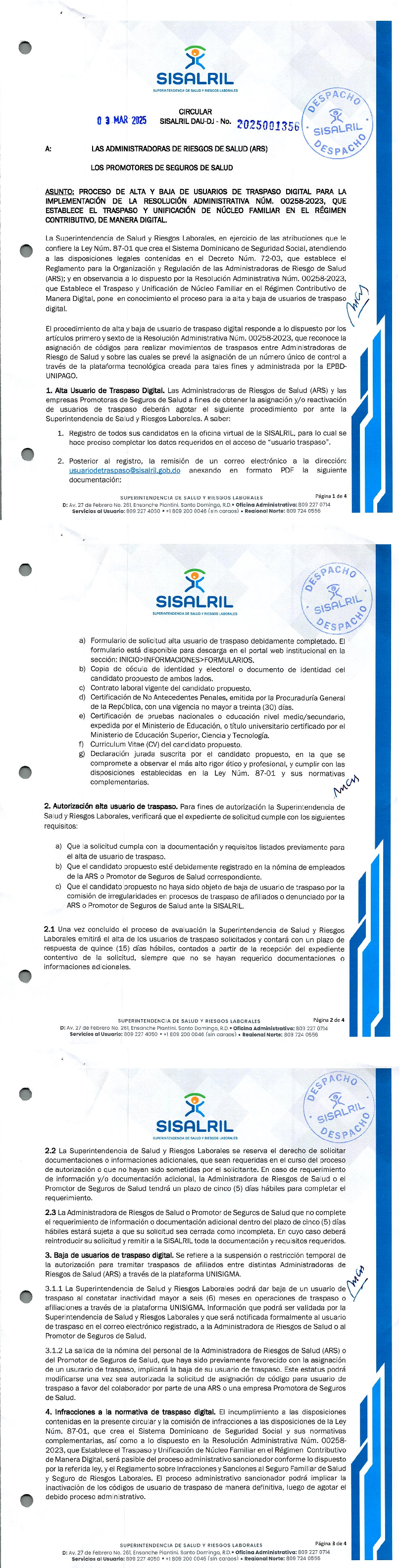 Circular SISALRIL-DAU-DJ No. 2025001356. Proceso de Alta y Baja de Usuarios de Traspaso Digital para la Implementación de la Resolución Administrativa Núm. 00258-2023, que Establece el Traspaso y unificación de Núcleo Familiar en el Régimen Contributivo, de Manera Digital.