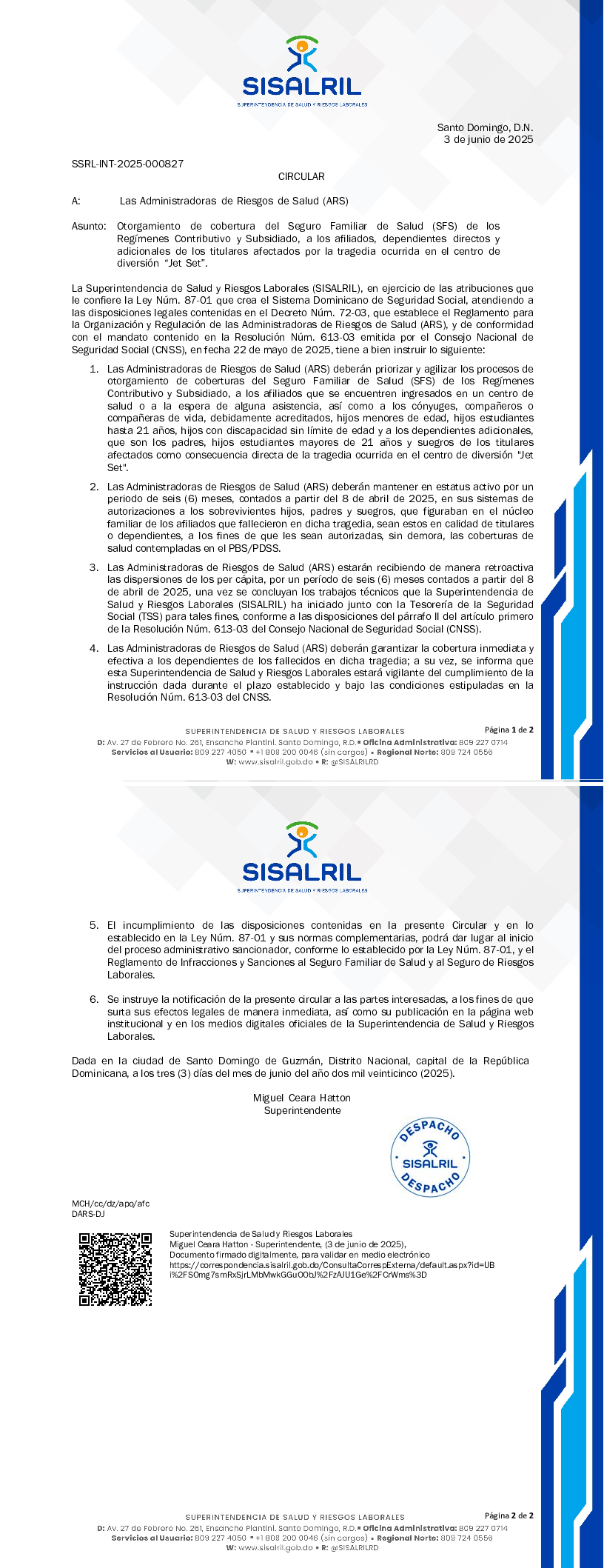Circular SSRL-INT-2025-000827, sobre el Otorgamiento de cobertura del Seguro Familiar de Salud (SFS) de los Regímenes Contributivo y Subsidiado, a los afiliados, dependientes directos y adicionales de todos los titulares afectados de la tragedia ocurrida en el centro de diversión Jet Set