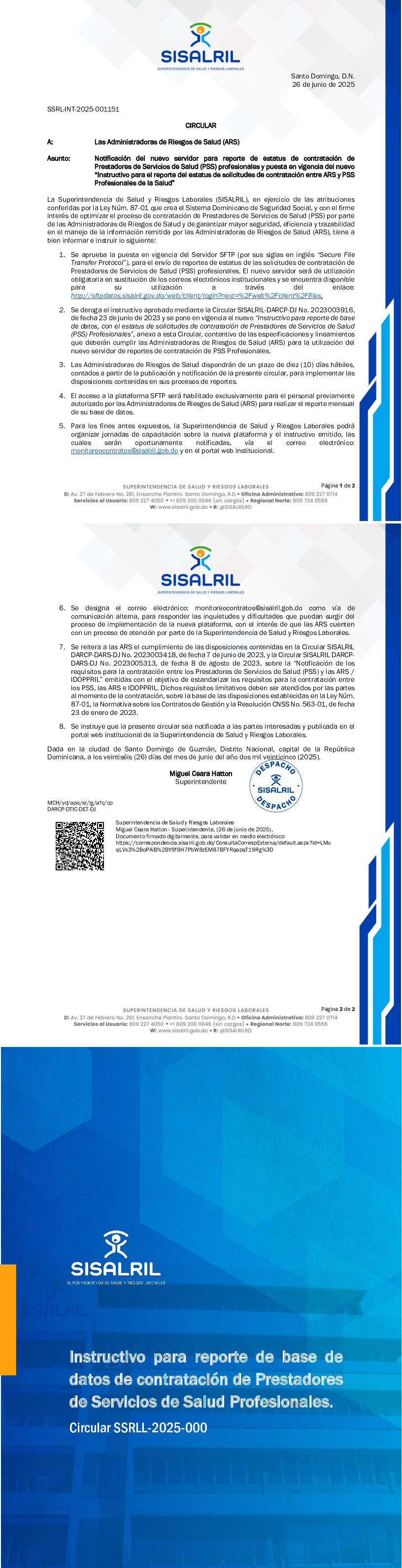 Circular SSRL-INT-2025-001151 Notificación del nuevo servidor para reporte de estatus de contratación de Prestadores de Servicios de Salud (PSS) profesionales y puesta en vigencia del nuevo Instructivo para el reporte del estatus de solicitudes de contratación entre ARS y PSS Profesionales de la Salud