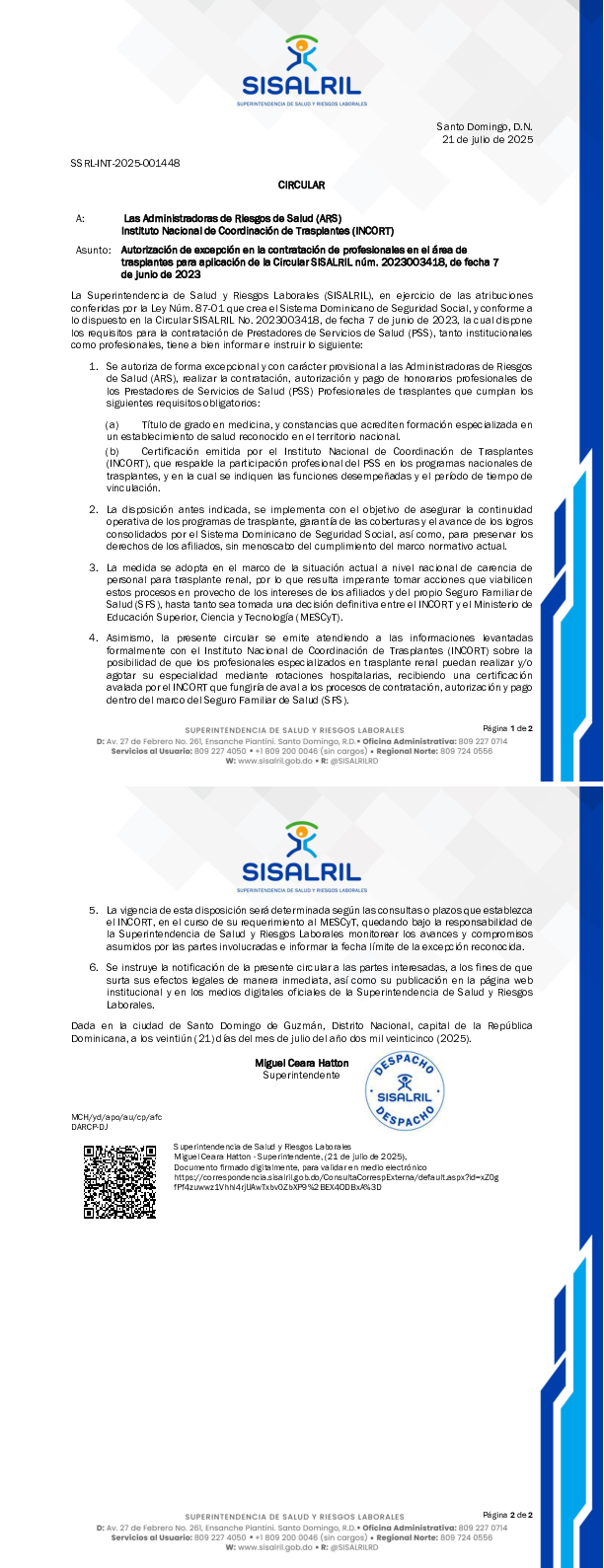 Circular SSRL-INT-2025-001448 Autorización excepción contratación profesionales en área de trasplantes para aplicación de Circular SISALRIL Núm. 2023003418
