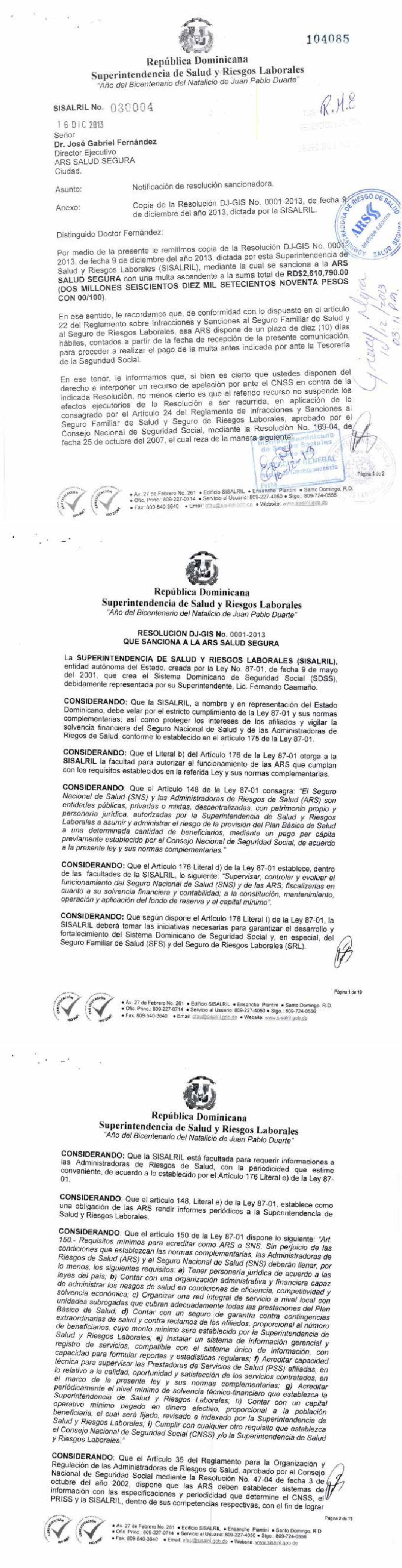 D104085 DJ-GIS No. 0001-2013 Que sanciona a la ARS SALUD SEGURA