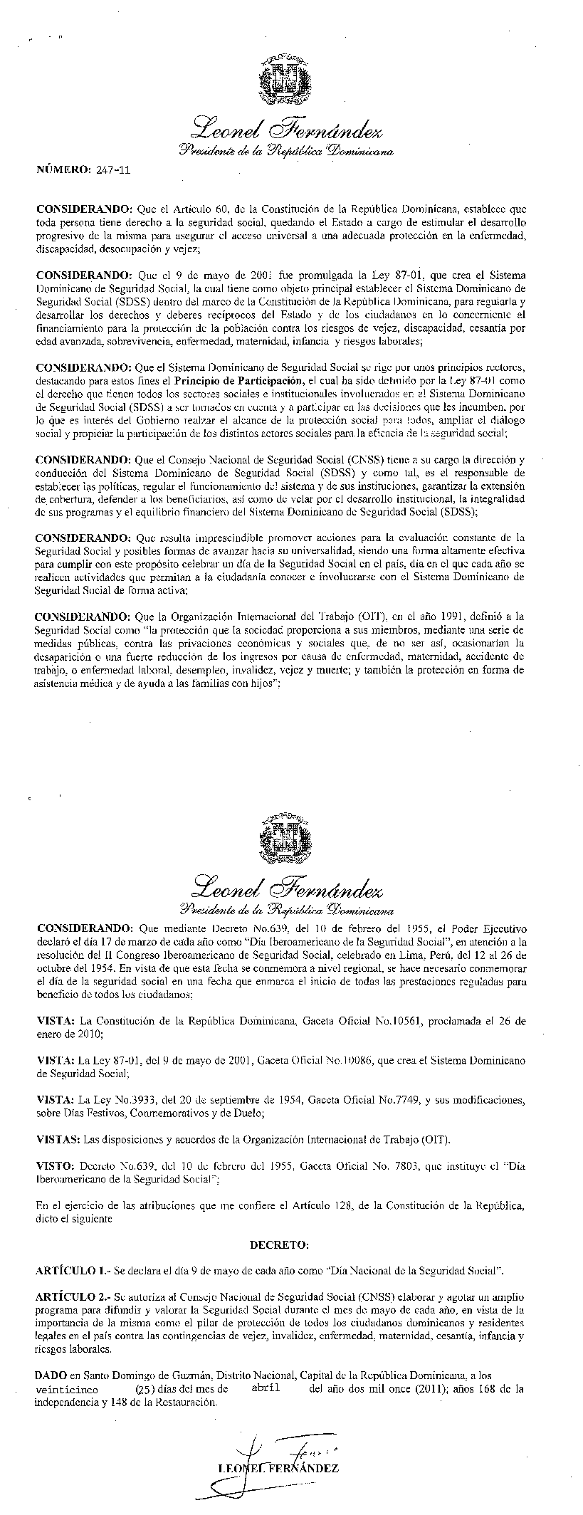 Decreto Nº 247-11. Decreto que Declara el Dia 9 de Mayo de Cada Año, como ¨dia Nacional de la Seguridad Social¨. G. O. No. 10614 del 27 de Abril de 2011.