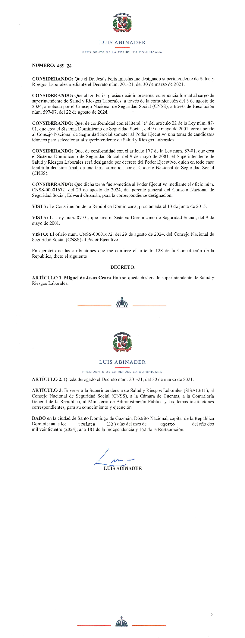 Decreto Nº 489-24. Que designa al Señor Miguel de Jesús Ceara Hatton, Superintendente de Salud y Riesgos Laborales. Deroga el Decreto núm. 201-21.