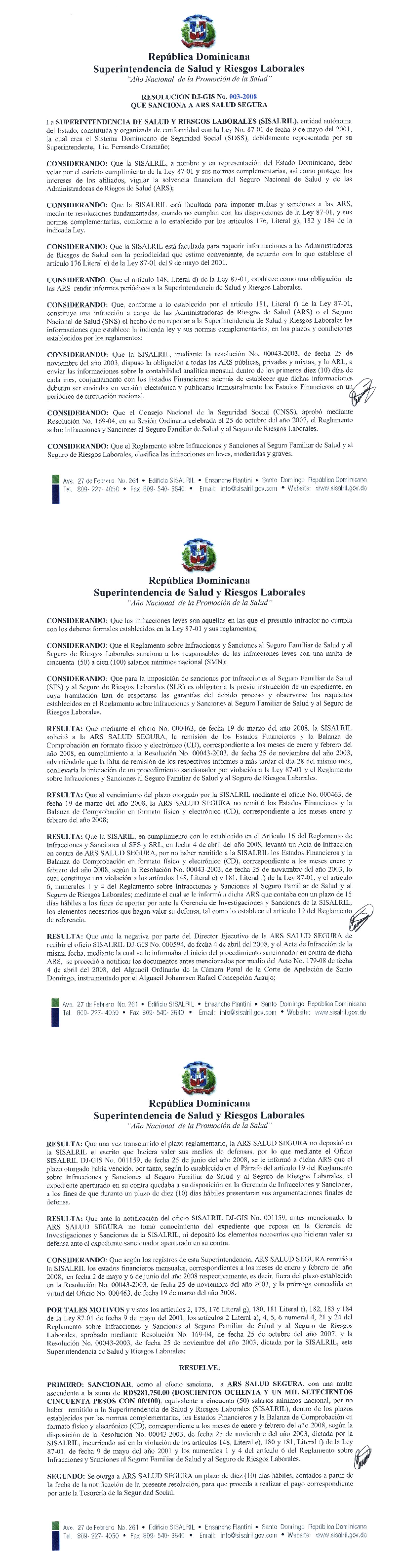 DJ-GIS 003-2008 Que Sanciona a ARS Salud Segura