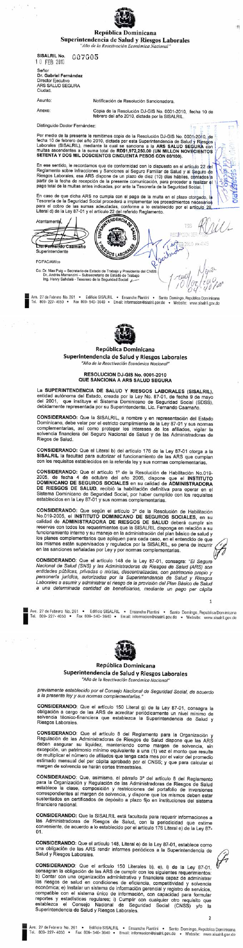 DJ-GIS No 0001-2010 que Sanciona a ARS Salud Segura