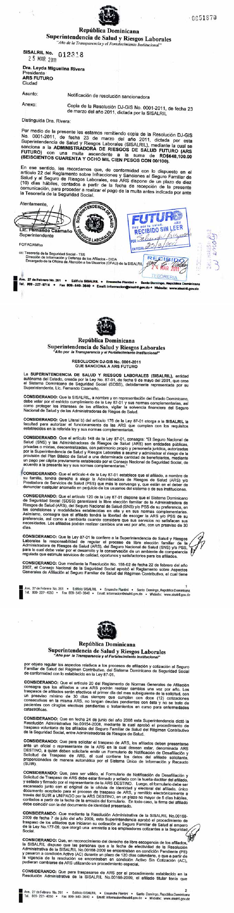 DJ-GIS No 0001-2011 que Sanciona a ARS FUTURO
