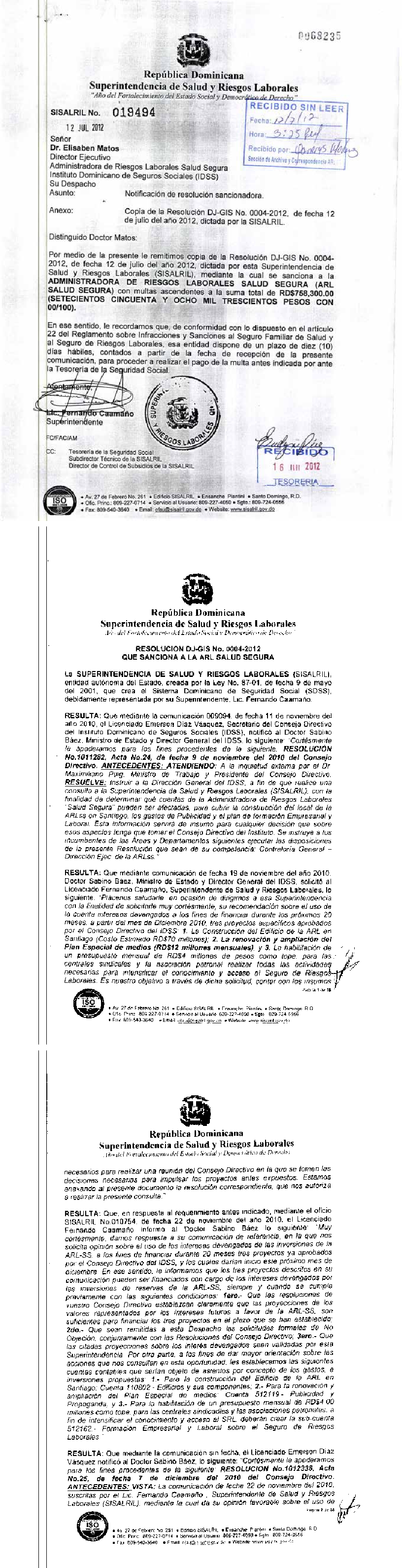 DJ-GIS No. 0004-2012 Que sanciona a la ARL SALUD SEGURA