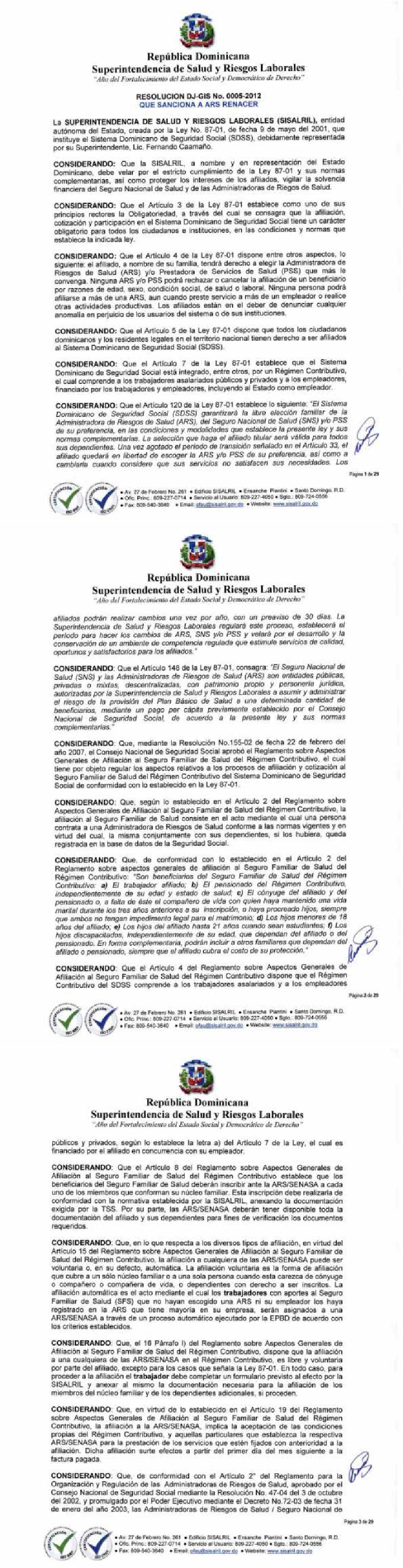 DJ-GIS No. 0005-2012 Que sanciona a la ARS RENACER
