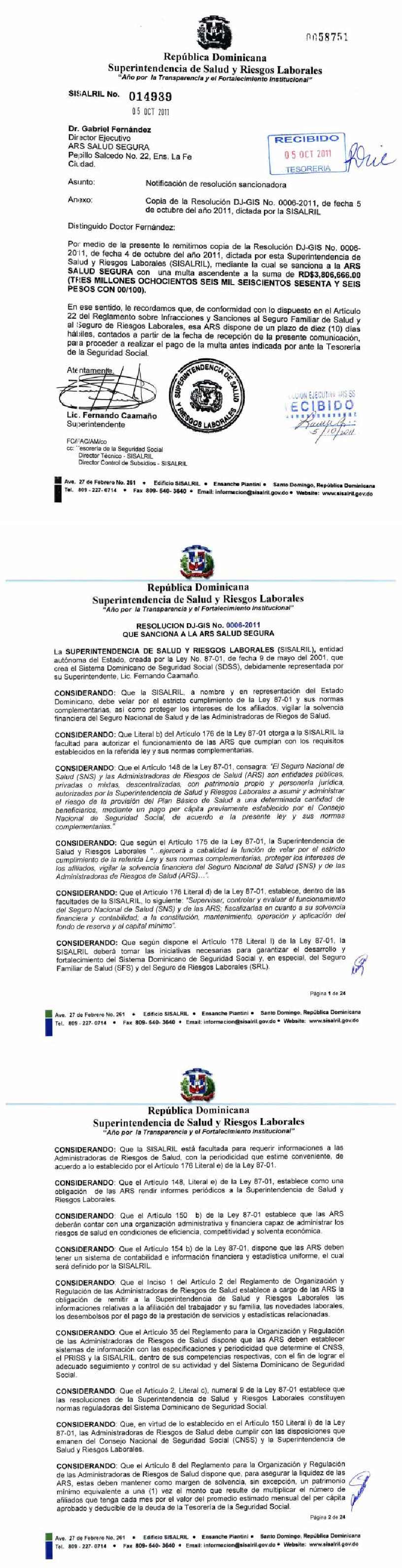 DJ-GIS No 0006-2011 que Sanciona a ARS SALUD SEGURA