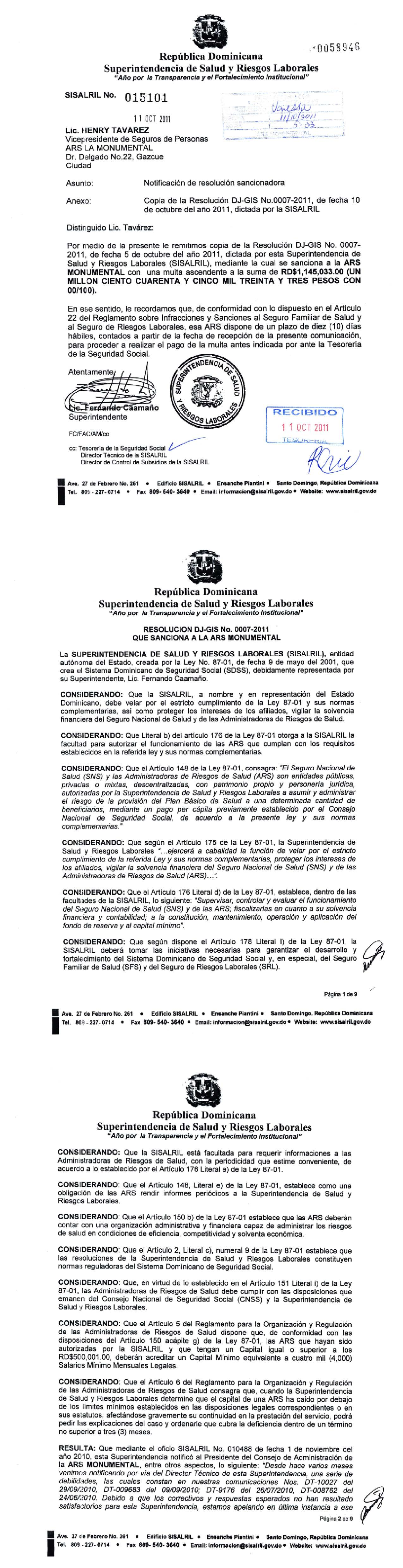 DJ-GIS No 0007-2011 que Sanciona a ARS LA MONUMENTAL