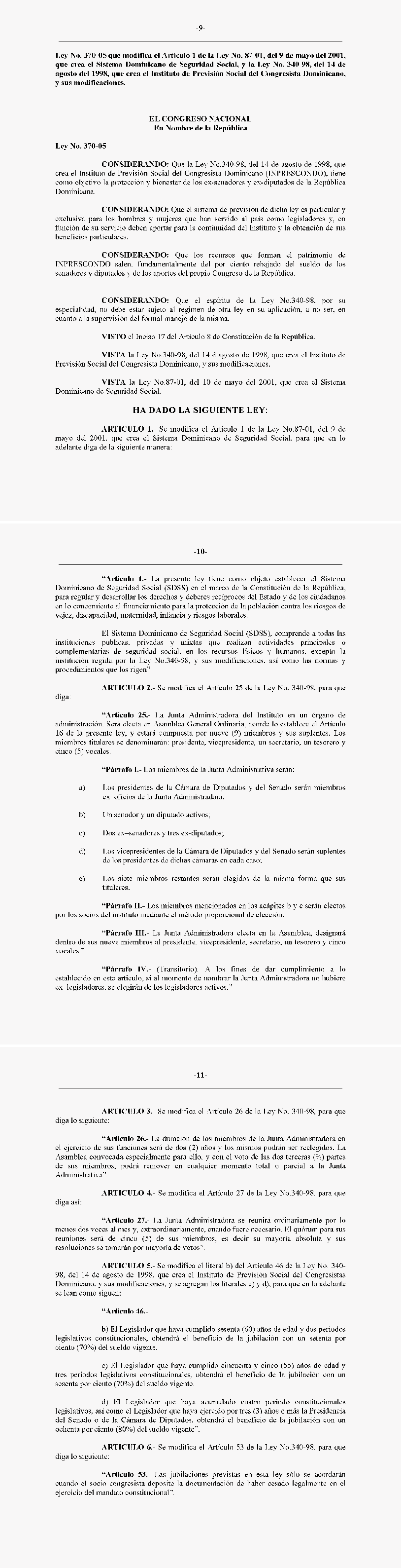 Ley No. 370-05 que modifica el Articulo 1 de la Ley No. 87-01, del 9 de mayo del 2001, que crea el Sistema Dominicano de Seguridad Social, y la Ley No. 340-98, del 14 de agosto del 1998.