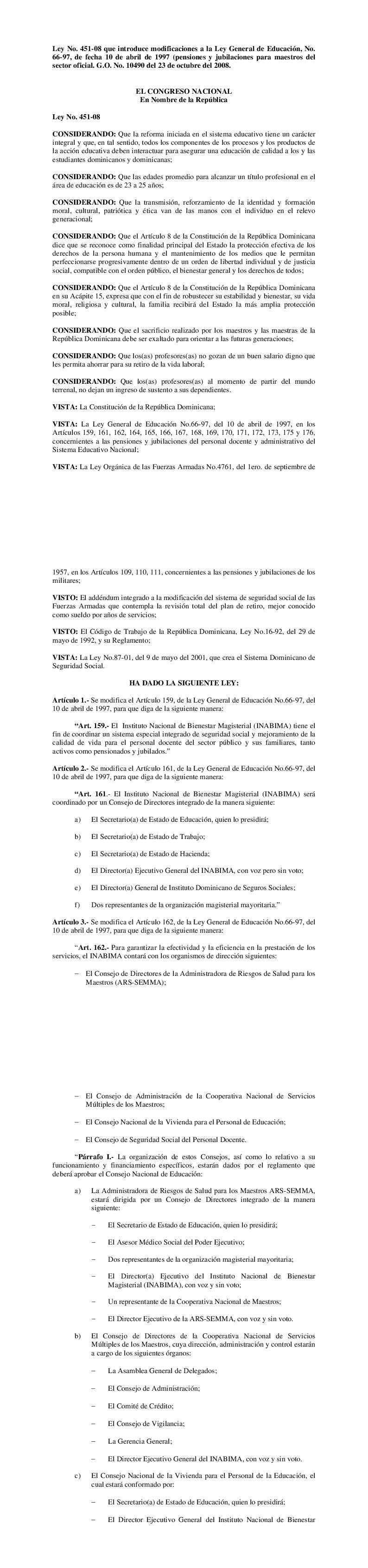Ley No. 451-08 que introduce modificaciones a la Ley General de Educación, No. 66-97, de fecha 10 de abril de 1997 (pensiones y jubilaciones para maestros del sector oficial. G.O. No. 10490 del 23 de octubre del 2008.