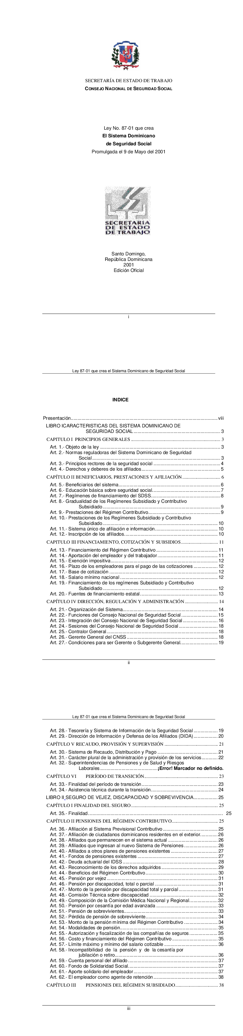 Ley No. 87-01 que crea El Sistema Dominicano de Seguridad Social Promulgada el 9 de Mayo del 2001