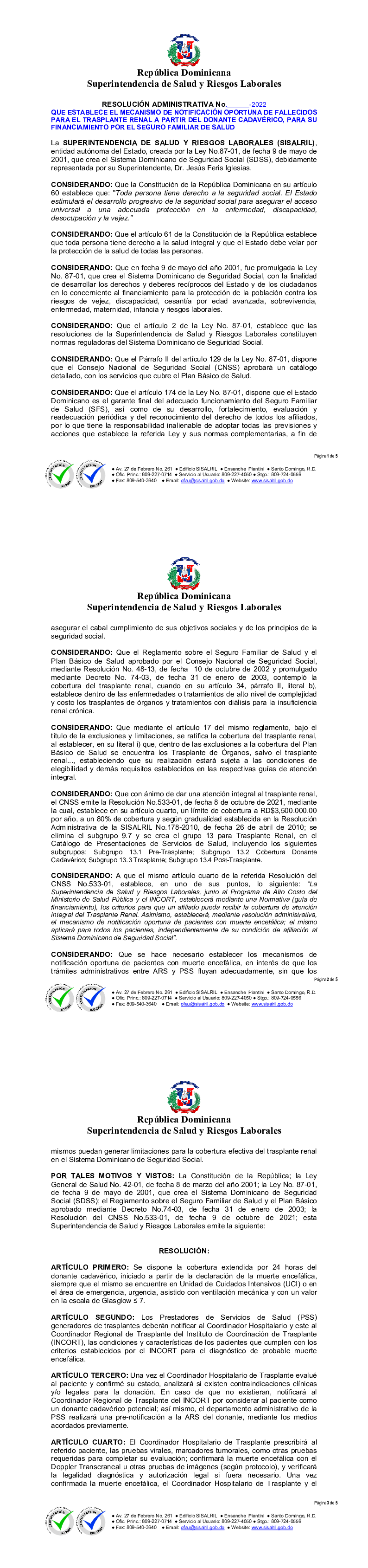 Propuesta de Res. Adm. que establece el mecanismo de notificacin oportuna de fallecidos