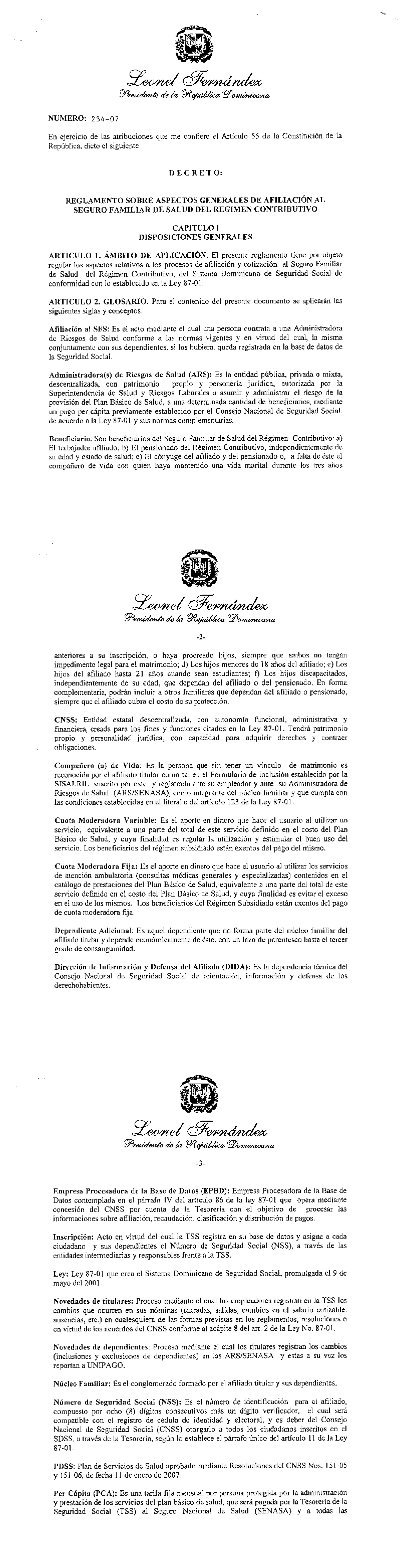 Reglamento sobre Aspectos Generales de Afilación al Seguro Familiar de Salud del Regimen Contributivo.
