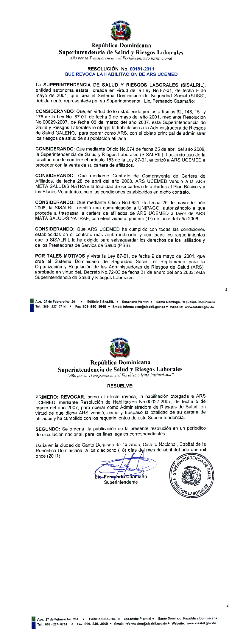 Res. ADM No. 00181-2011 que revoca habilitacion ARS Ucemed
