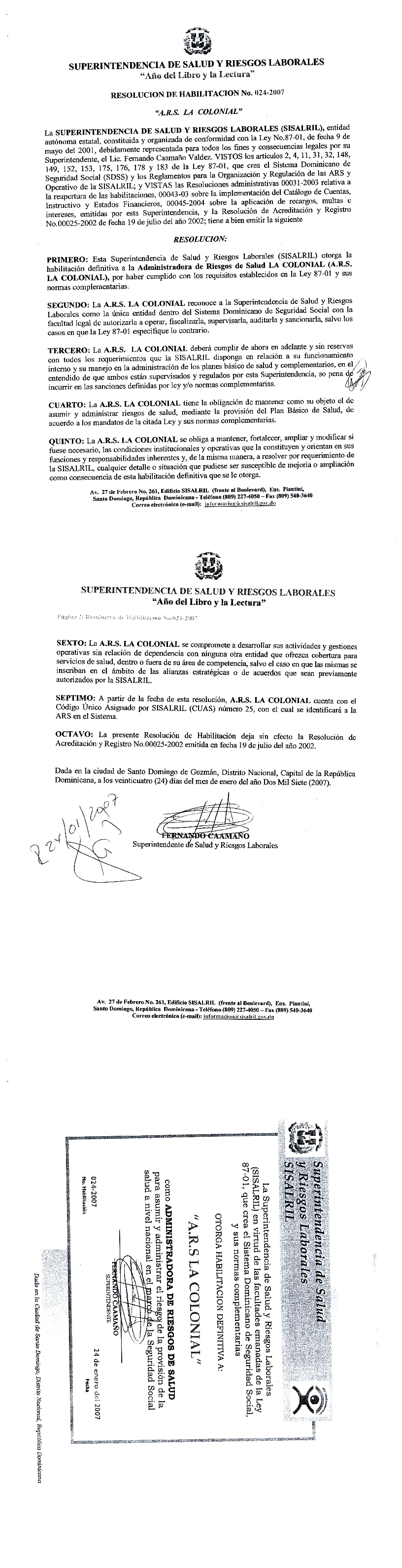 Res. Habilitacion No.024-2007 LA COLONIAL