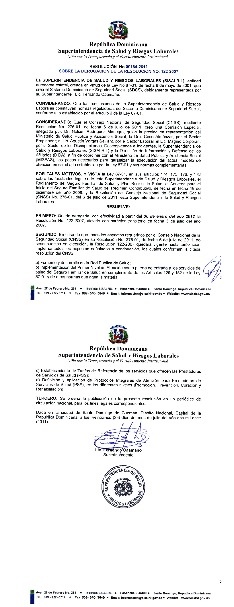 Res No 00184-2011 sobre la derogacion de la Resolucion No. 122-2007