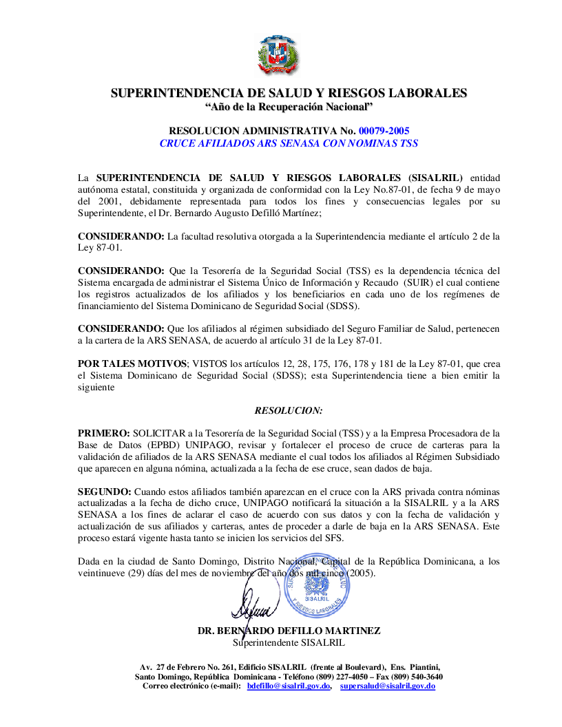 res_adm_no_00079-2005 Cruce UNIPAGO-TSS-ARS SENASA