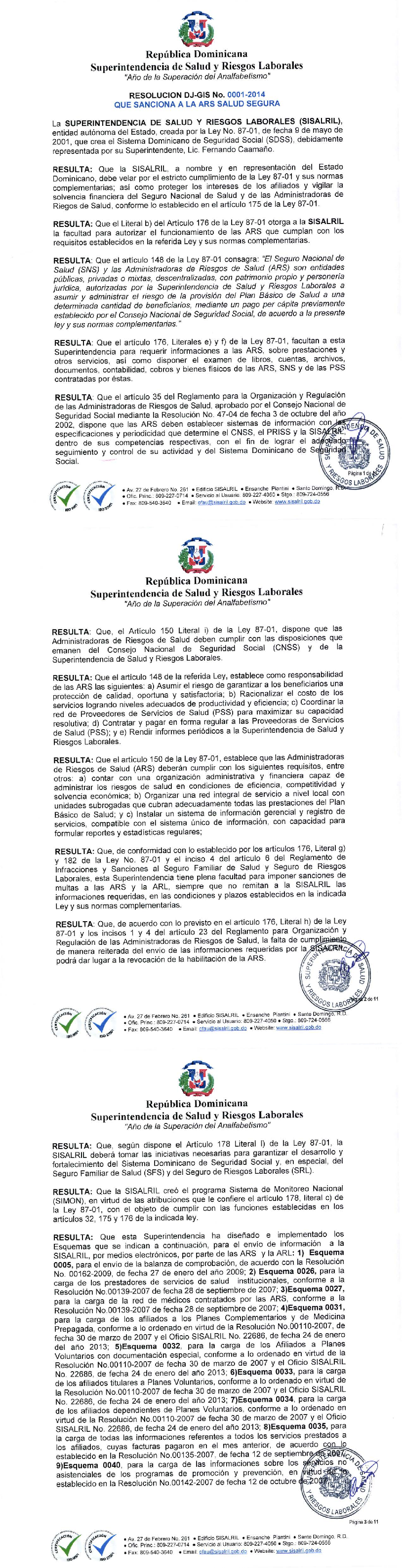 RESOLUCION DJ-GIS No.0001-2014 que sanciona a la ARS SALUD SEGURA