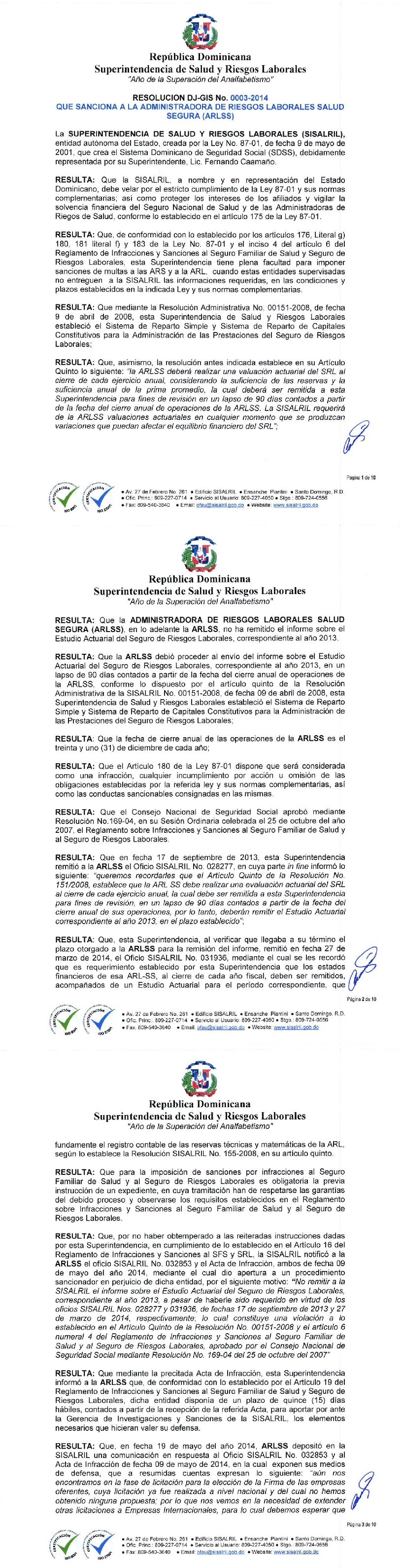 RESOLUCION DJ-GIS No.0003-2014 que sanciona a la ARL