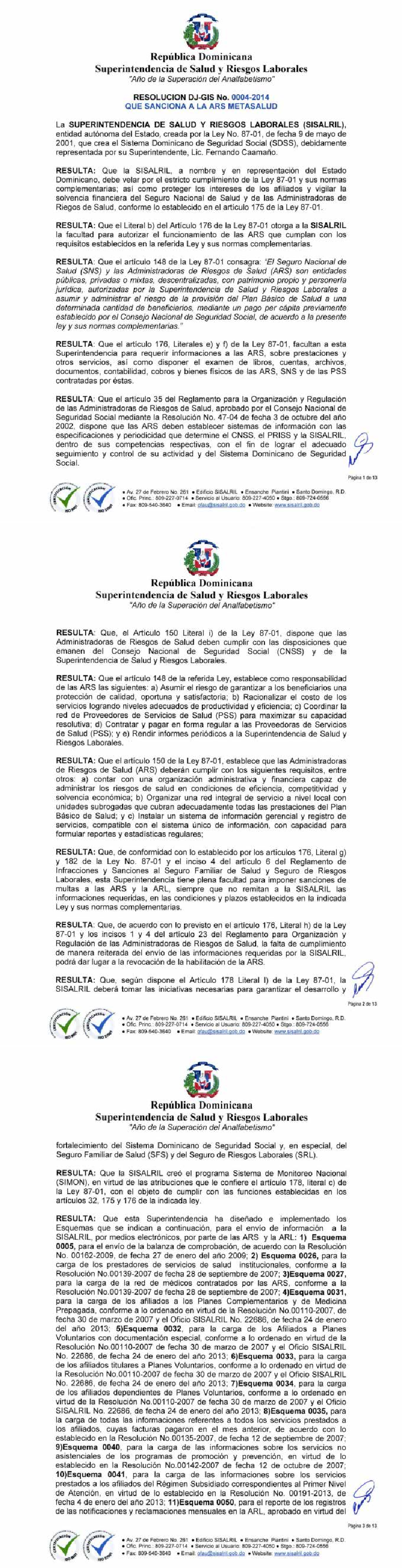RESOLUCION DJ-GIS No.0004-2014 que sanciona a la ARS METASALUD