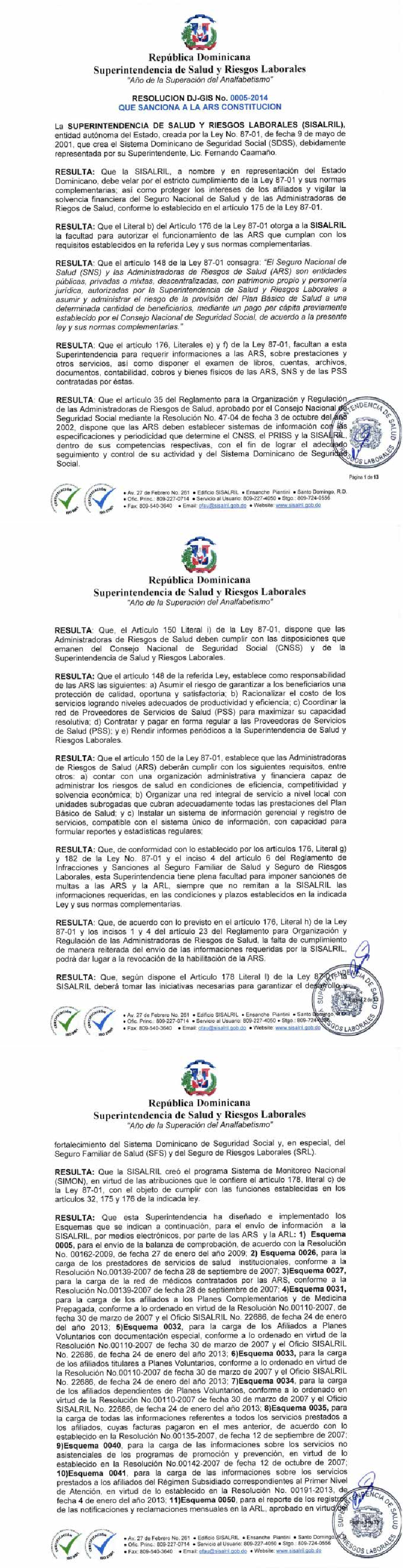 RESOLUCION DJ-GIS No.0005-2014 que sanciona a la ARS Constitucin