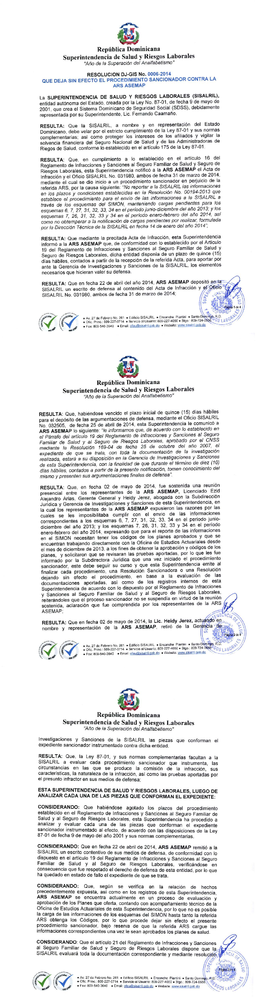 RESOLUCION DJ-GIS No.0006-2014 que descarga a la ARS ASEMAP
