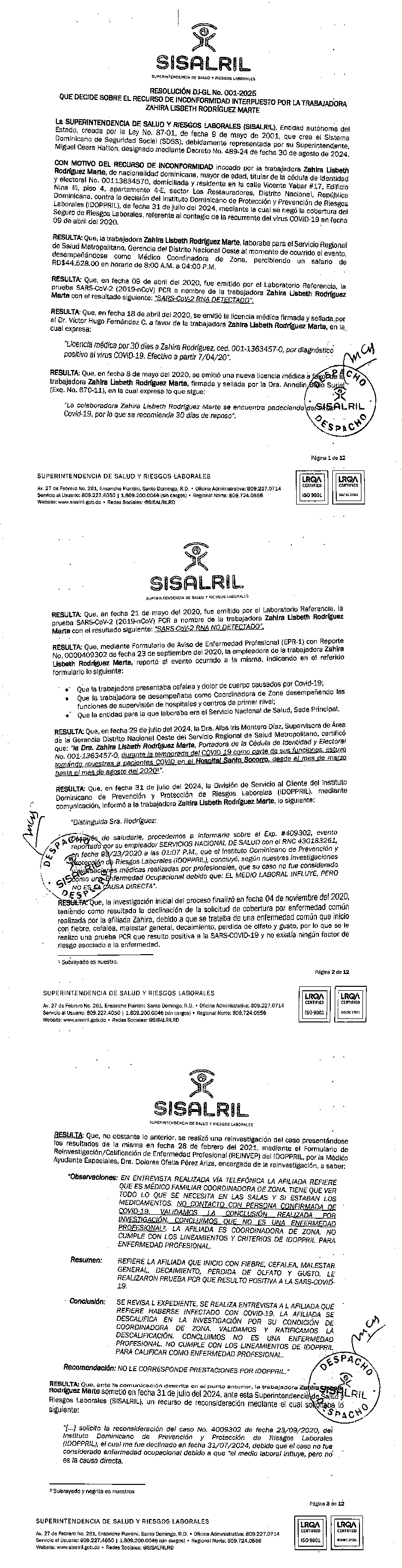 Resolución DJ-GL No. 001-2025, que decide el recurso de inconformidad interpuesto por la Sra. Zahira Lisbeth Rodríguez.